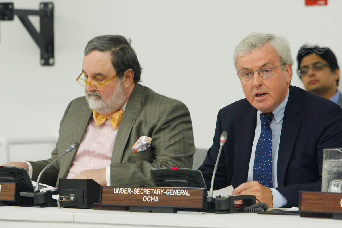 John Holmes, Under-Secretary-General for Humanitarian Affairs and Emergency Relief Coordinator, launches a humanitarian response plan for Pakistan where an estimated 14 million people have been affected by severe floods. Almost $460 million has been requested for emergency relief there. Pictured beside Mr. Holmes is Abdullah Hussain Haroon, Permanent Representative of Pakistan to the UN.