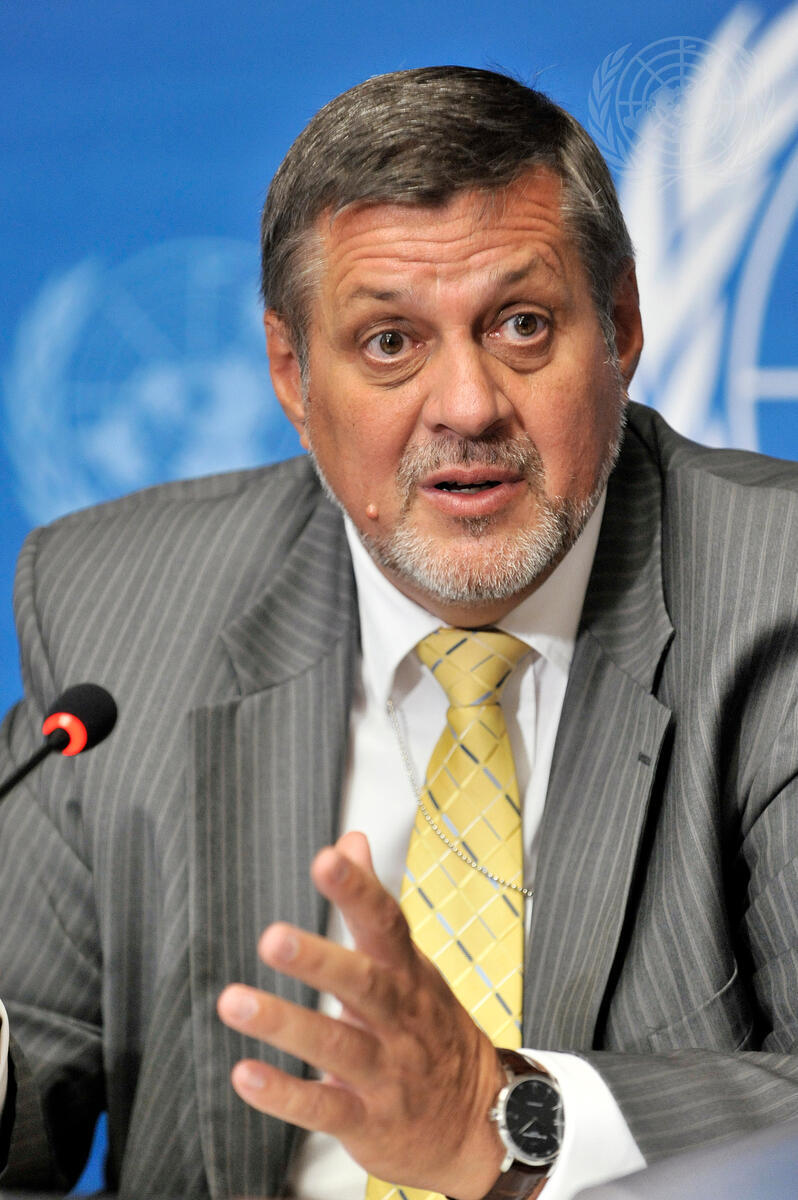 Jan Kubis, Executive Secretary of the UN Economic Commission for Europe (UNECE), holds a press conference in Geneva, Switzerland, on the UNECE and the International Basketball Federation (FIBA)'s joint campaign to promote safe driving. The campaign, whose motto reads ""We Play and Drive by the Rules"", is timed to coincide with the coming 2010 FIBA World Championship in Turkey.