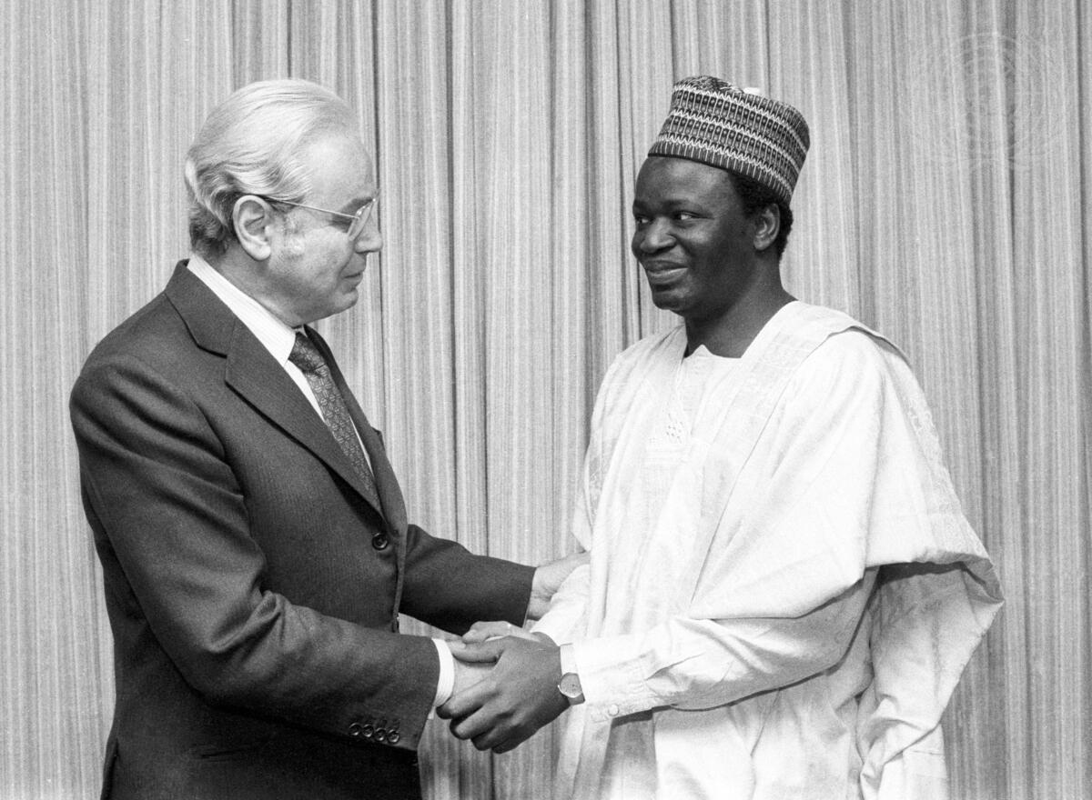 Secretary-General Javier Perez de Cuellar (left), meeting with Ibrahim Agboola Gambari, Minister for Foreign Affairs of Nigeria, at UN Headquarters today.