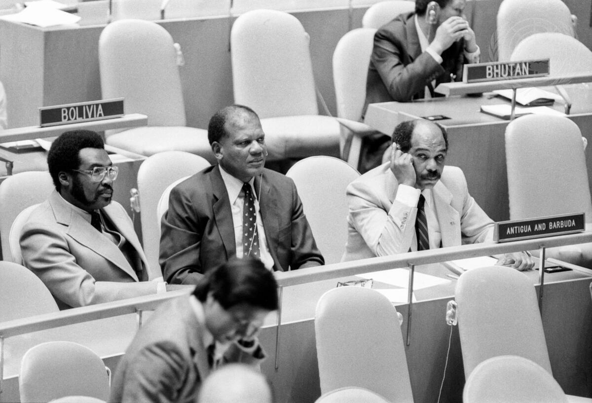 Lloydstone Jacobs (right), Chairman of the delegation of Antigua and Barbuda, seated with the other members just prior to addressing the General Assembly on 11 October.