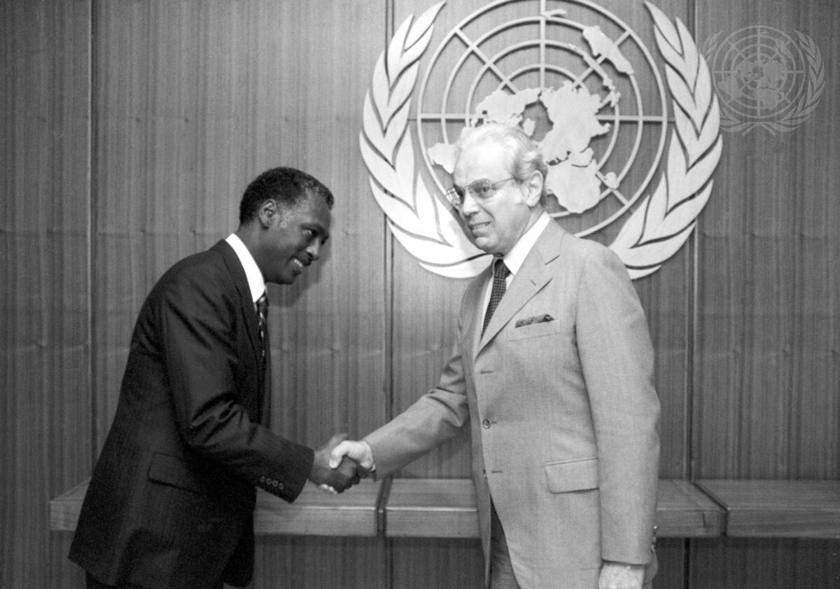 Ambassador Berhanu Dinka, the new Permanent Representative of Ethiopia to the United Nations, today presented his credentials to the Secretary-General Javier Perez de Cuellar (right) at United Nations Headquarters.
