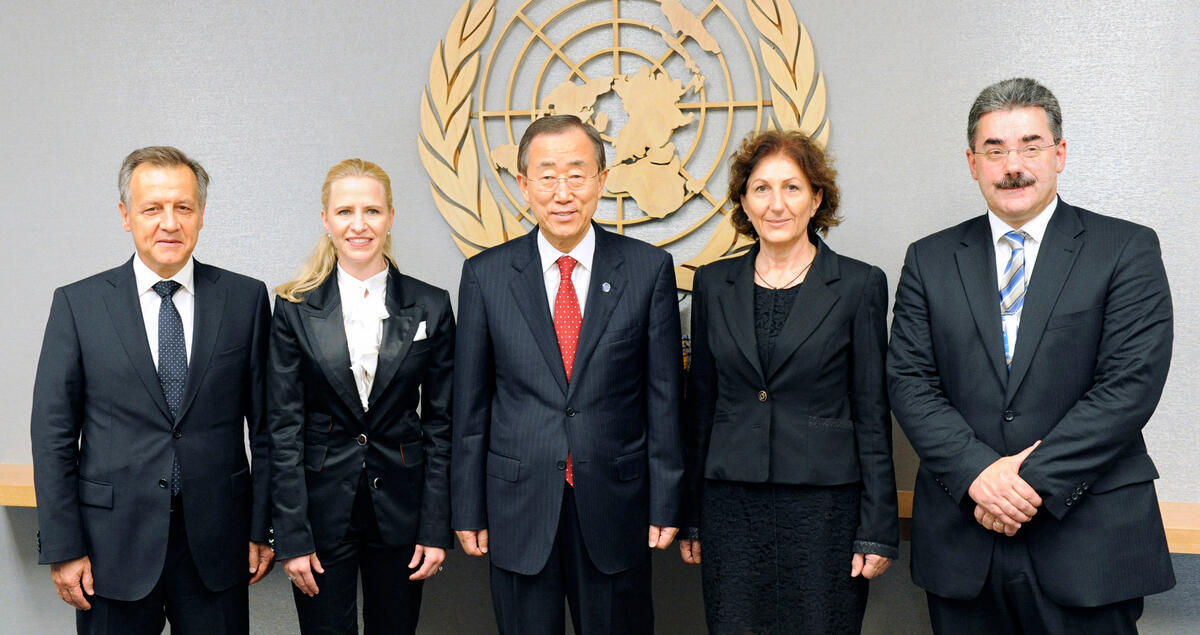 Secretary-General Ban Ki-moon (centre) meets with a delegation from the Principality of Liechtenstein, including Aurelia Frick (second from left), Minister for Foreign Affairs, and parliamentarians.