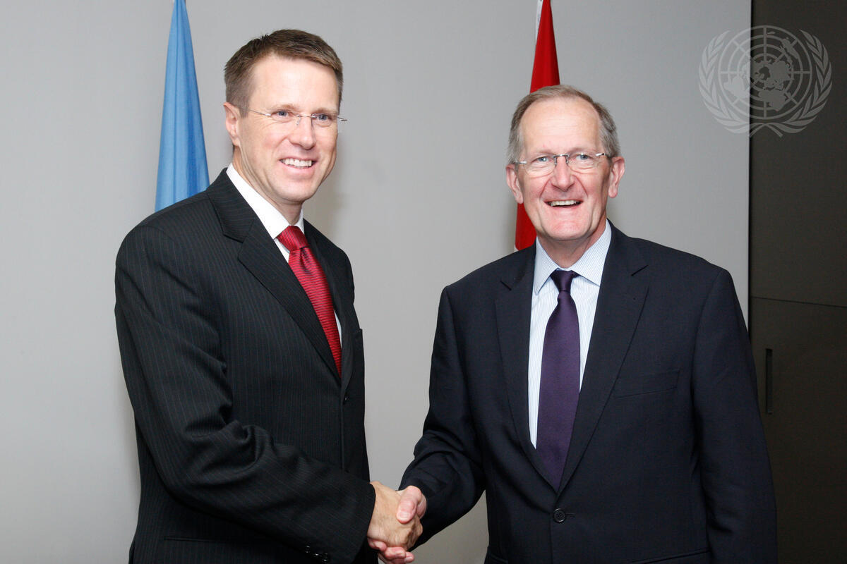 Joseph Deiss (right), President of the sixty-fifth session of the General Assembly, meets with Samuel Žbogar, Minister for Foreign Affairs of the Republic of Slovenia.