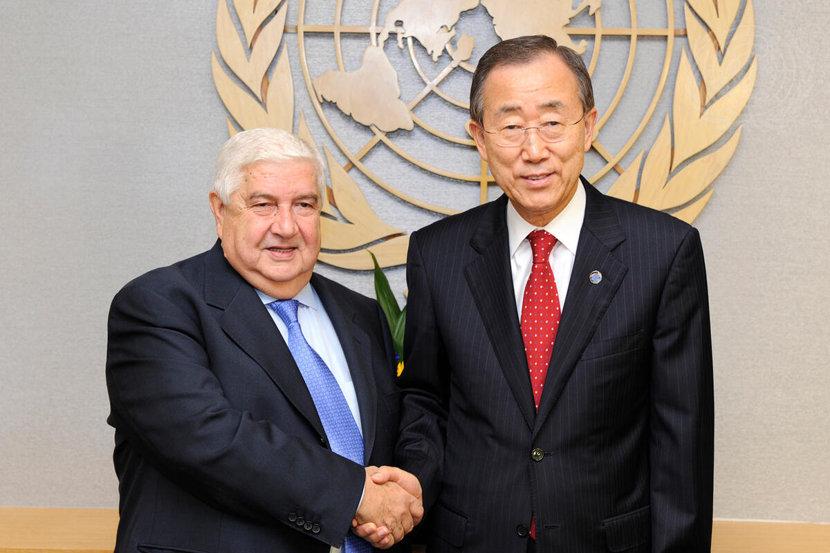 Secretary-General Ban Ki-moon (right) meets with Walid Al-Moualem, Minister for Foreign Affairs of the Syrian Arab Republic.
