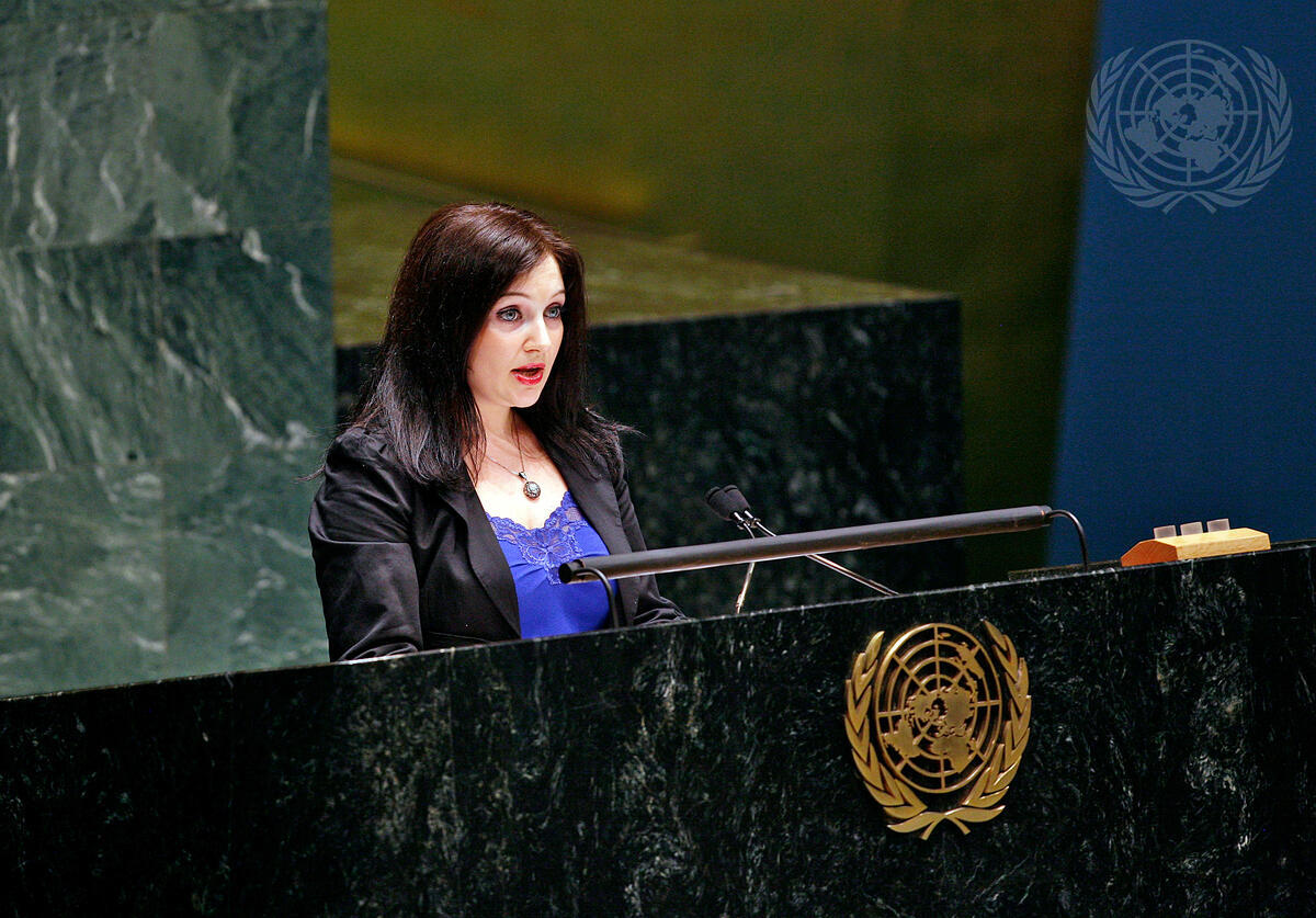 Tetiana Pokhval'ona, Second Secretary at the Permanent Mission of Ukraine to the United Nations and Adviser on the General Assembly's First Committee on Disarmament and International Security, presents her Committee's reports to the Assembly.