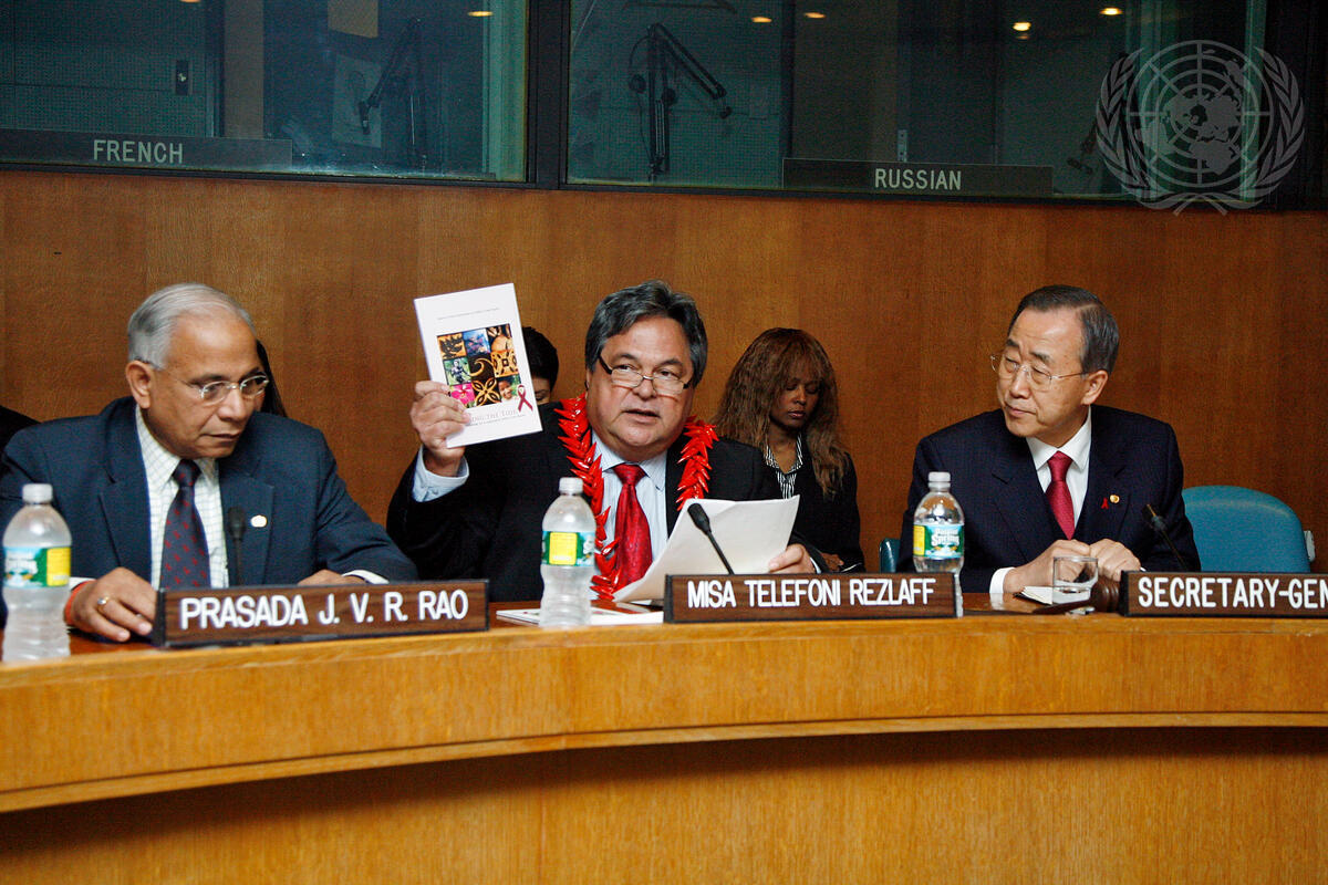 Secretary-General Ban Ki-moon (right) attends a hand-over ceremony to receive the Commission on AIDS in the Pacific's Report. The report was handed over by Misa Telefoni Retzlaff (centre), Chairman of the Commission, while Prasada Rao (left), Regional Director of the United Nations Joint Programme on HIV/AIDS (UNAIDS) Regional Support Team for Asia and the Pacific, moderated the ceremony.