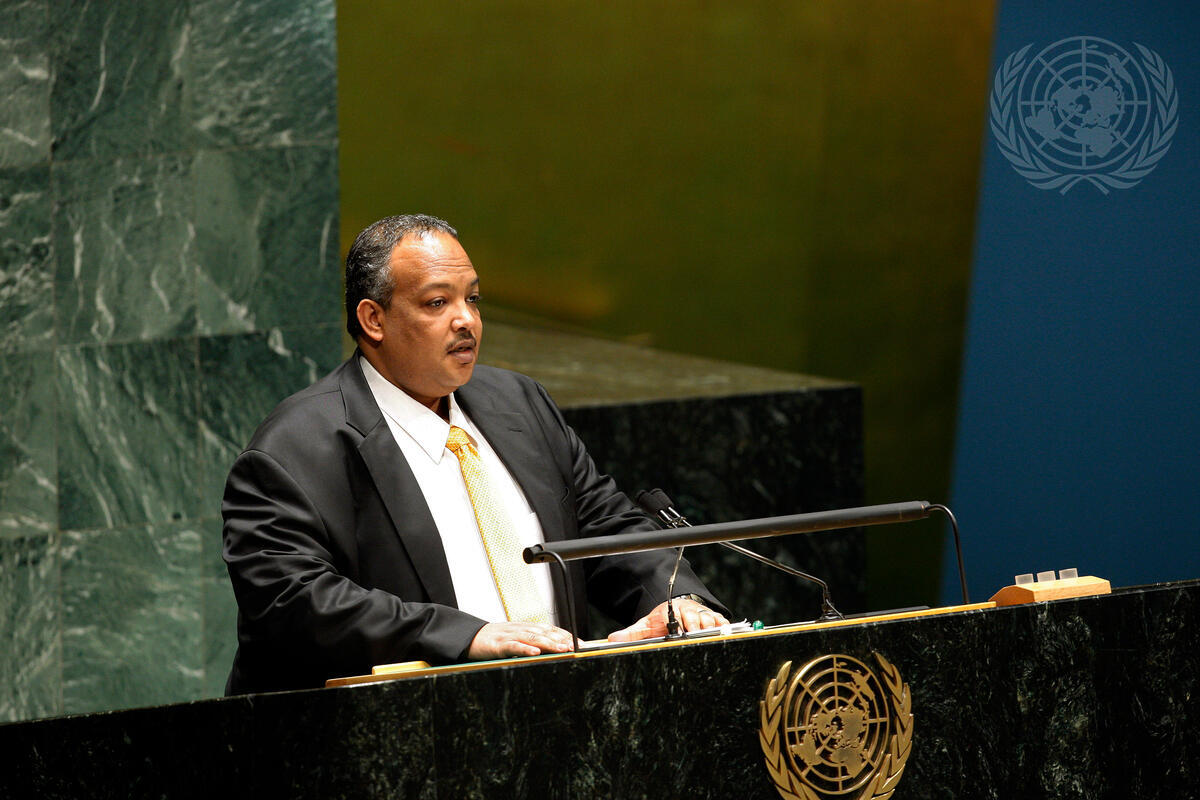 Khalid Mohammed Osman Sidahmed Mohammed Ali (Sudan), Rapporteur of the General Assembly's Fourth Committee (Special Political and Decolonization), introduces the Committee's reports to the Assembly plenary, prior to the Assembly's adoption of resolutions recommended by the Committee.