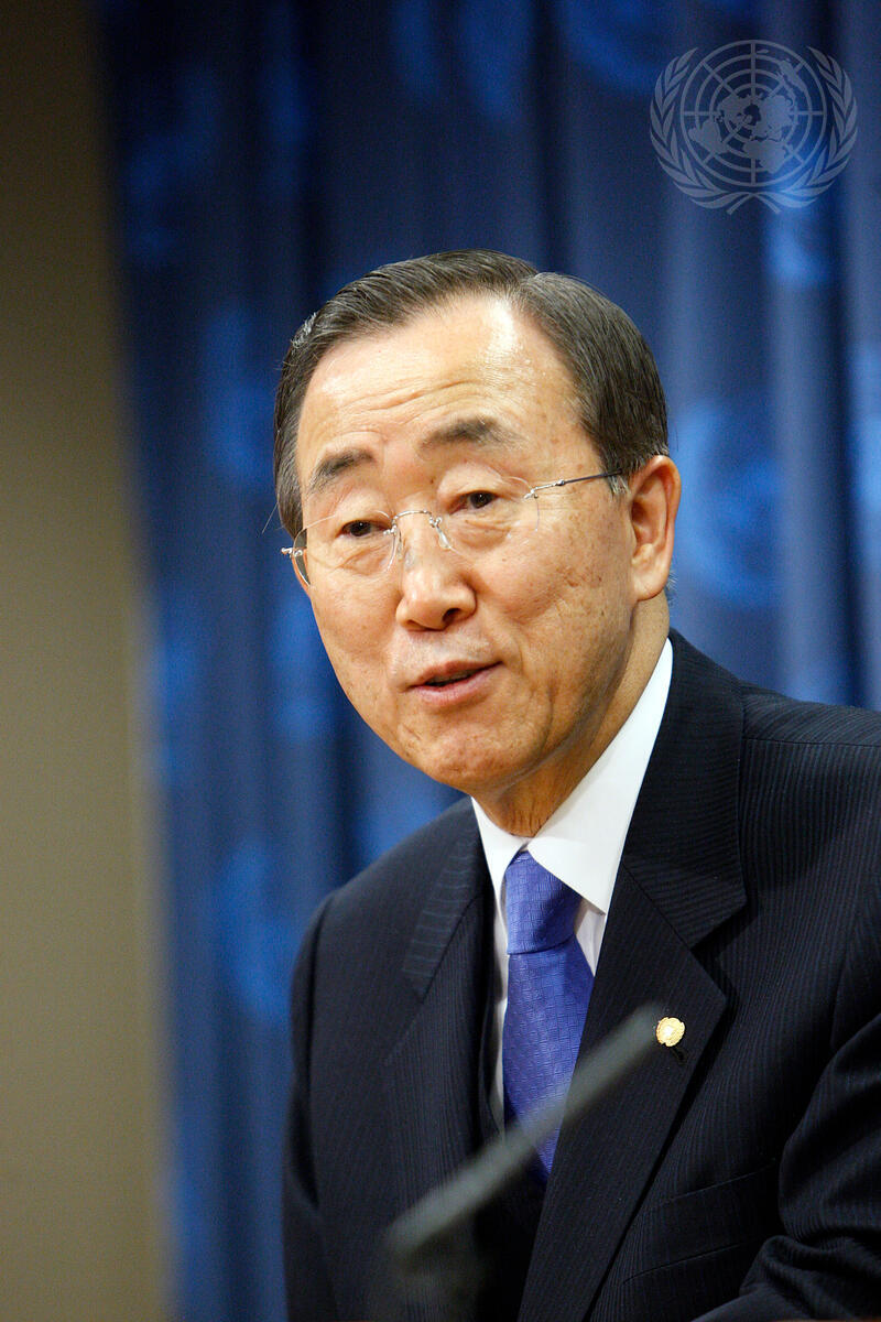 Secretary-General Ban Ki-moon speaks at a press conference following musician Stevie Wonder's designation as United Nations Messenger of Peace.