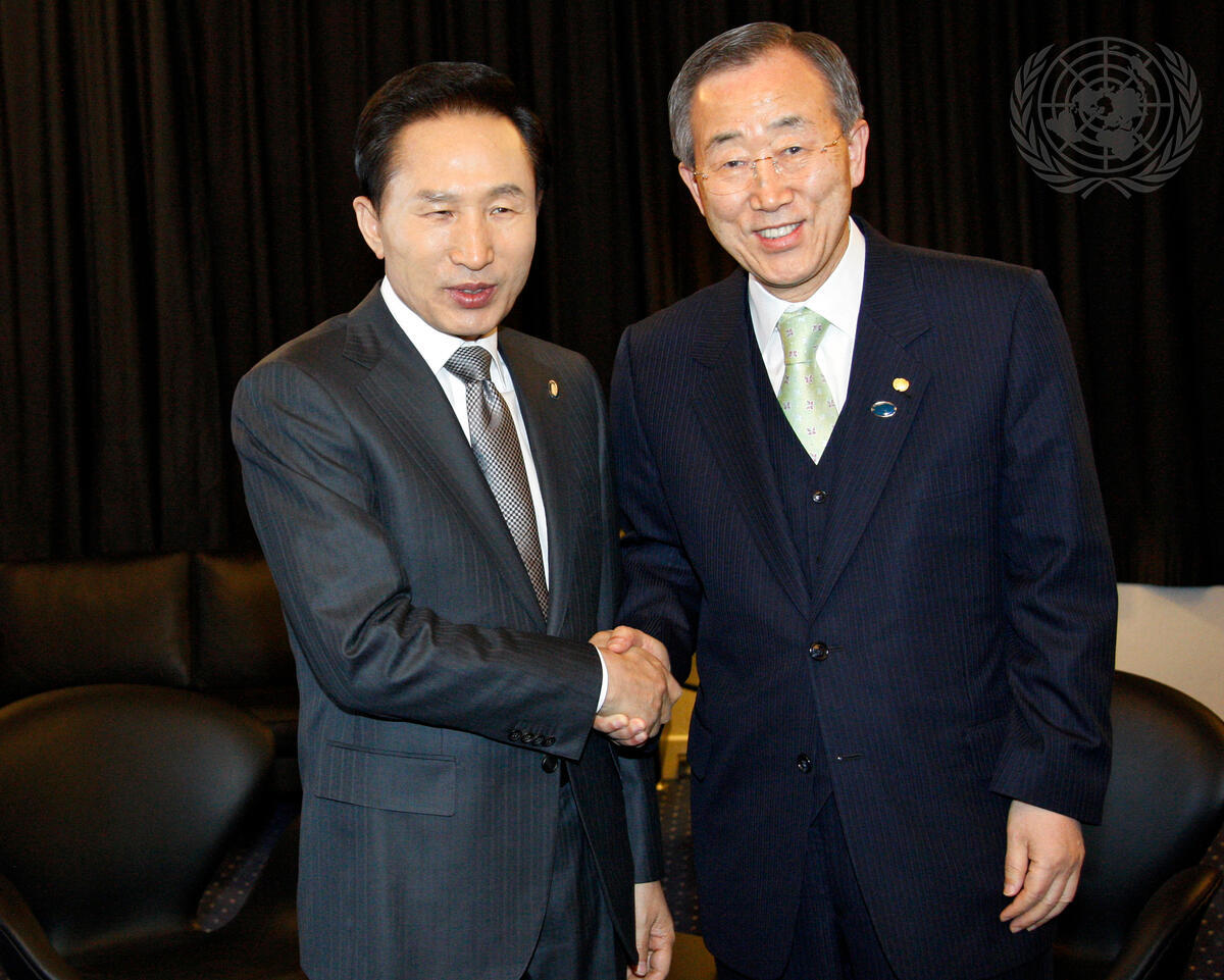 Secretary-General Ban Ki-moon (right) meets with Lee Myung-bak, President of the Republic of Korea, at the Bella Centre in Copenhagen, where the United Nations Climate Change Conference is taking place.