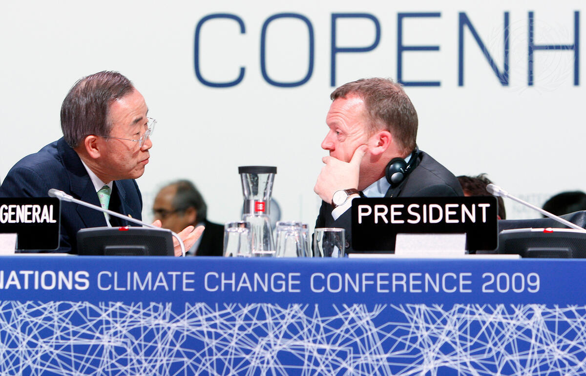 Secretary-General Ban Ki-moon (left) confers with Lars Løkke Rasmussen, Prime Minister of Denmark, during a suspension at the UN Climate Change Conference in Copenhagen.