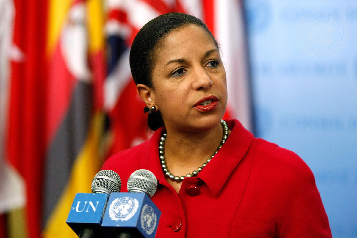 Susan E. Rice, Permanent Representative of the United States of America to the United Nations, speaks to journalists following a Security Council meeting on the Palestinian question.