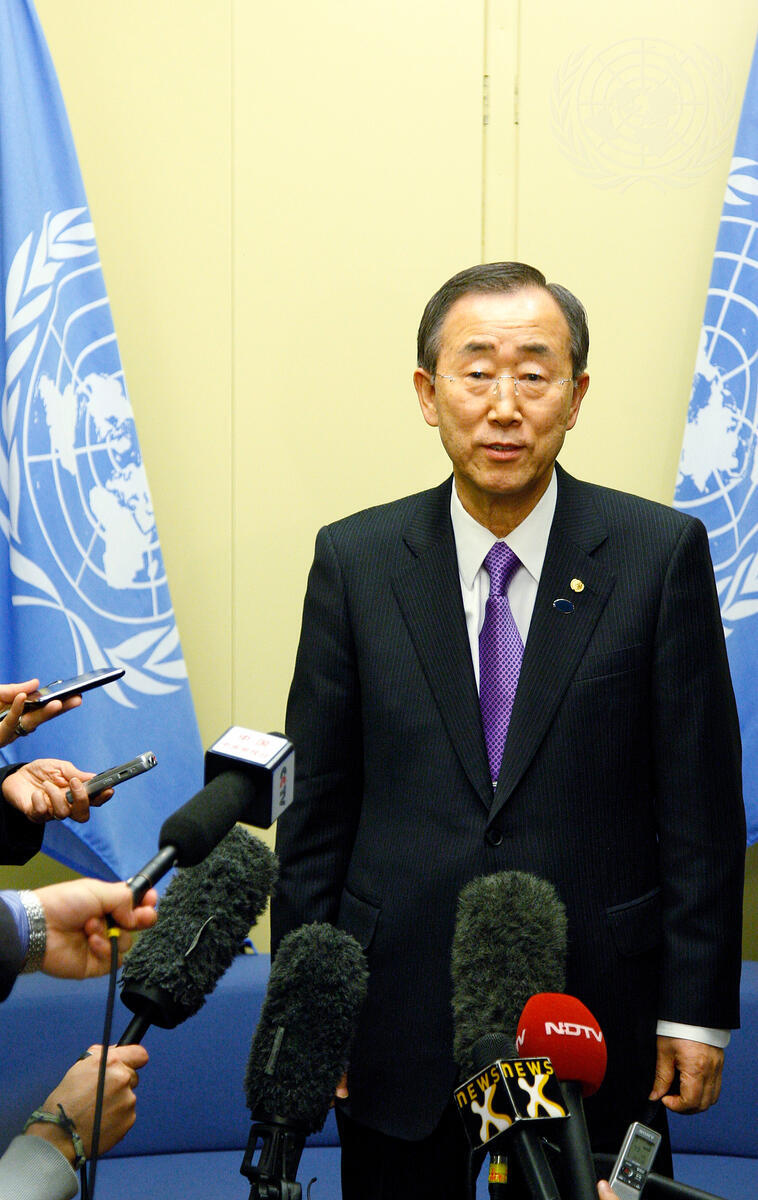 Secretary-General Ban Ki-moon briefs correspondents during the UN Climate Change Conference in Copenhagen.
