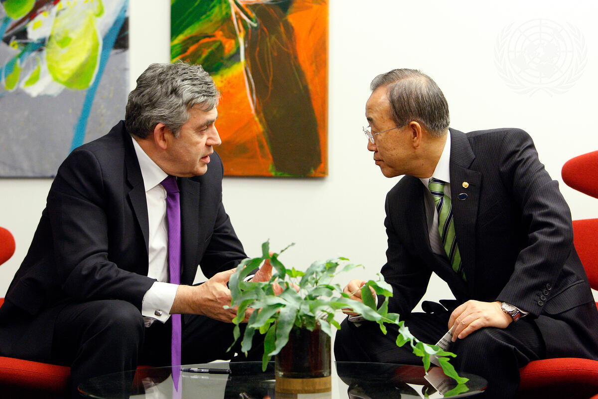Secretary-General Ban Ki-moon (right) meets with Gordon Brown, Prime Minister of the United Kingdom, at the Bella Centre in Copenhagen, where the United Nations Climate Change Conference is taking place.