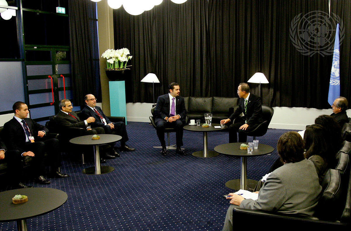 Secretary-General Ban Ki-moon (centre right) meets with Saad Hariri (centre left), Prime Minister of Lebanon, at the Bella Centre in Copenhagen, where the United Nations Climate Change Conference is taking place.