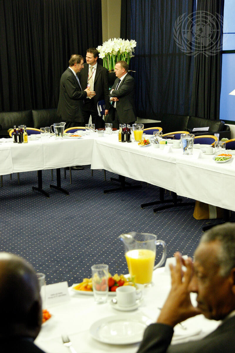 Janos Pasztor (standing, left), Director of the Secretary-General's Climate Change Support Team, converses with Lars Løkke Rasmussen (right), Prime Minister of Denmark, during a working lunch with delegates from the African Group, the Group of 77 and Least Developed Countries at the UN Conference on Climate Change. Mr. Rasmussen and Secretary-General Ban Ki-moon hosted the lunch.
