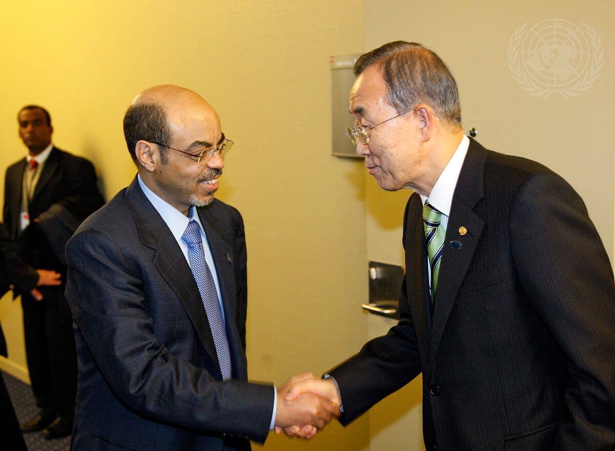 Secretary-General Ban Ki-moon (right) meets with Meles Zenawi, Prime Minister of Ethiopia, at the Bella Centre in Copenhagen, where the United Nations Climate Change Conference is taking place.