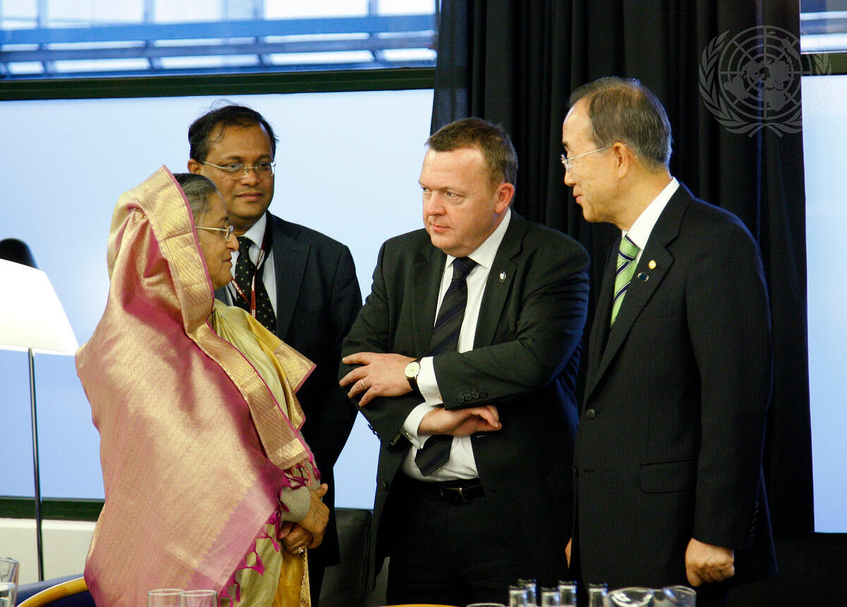 Secretary-General Ban Ki-moon (right) confers with Danish Prime Minister Lars Løkke Rasmussen (centre) and Bangladesh Prime Minister Sheikh Hasina (left) at the Bella Centre in Copenhagen, where the United Nations Climate Change Conference is taking place.