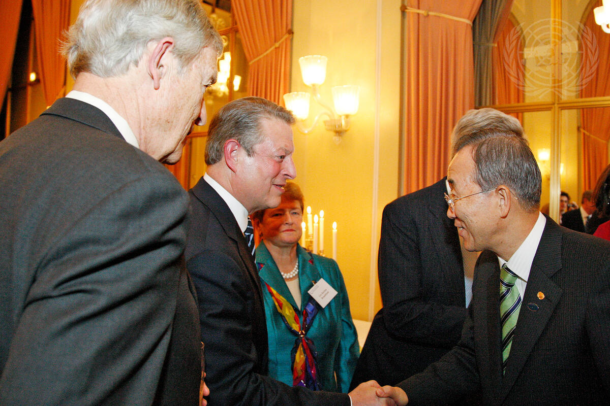 Secretary-General Ban Ki-moon (right) greets Nobel Laureate and climate advocate Al Gore (second from left) at a dinner hosted by the United Nations Foundation in honour of United States Senator John Kerry. Seen with them are Timothy E. Wirth (left), President of the UN Foundation, and Gro Harlem Brundtland (second from right, facing camera), UN Special Envoy on Climate Change and member of the UN Foundation Board of Directors.