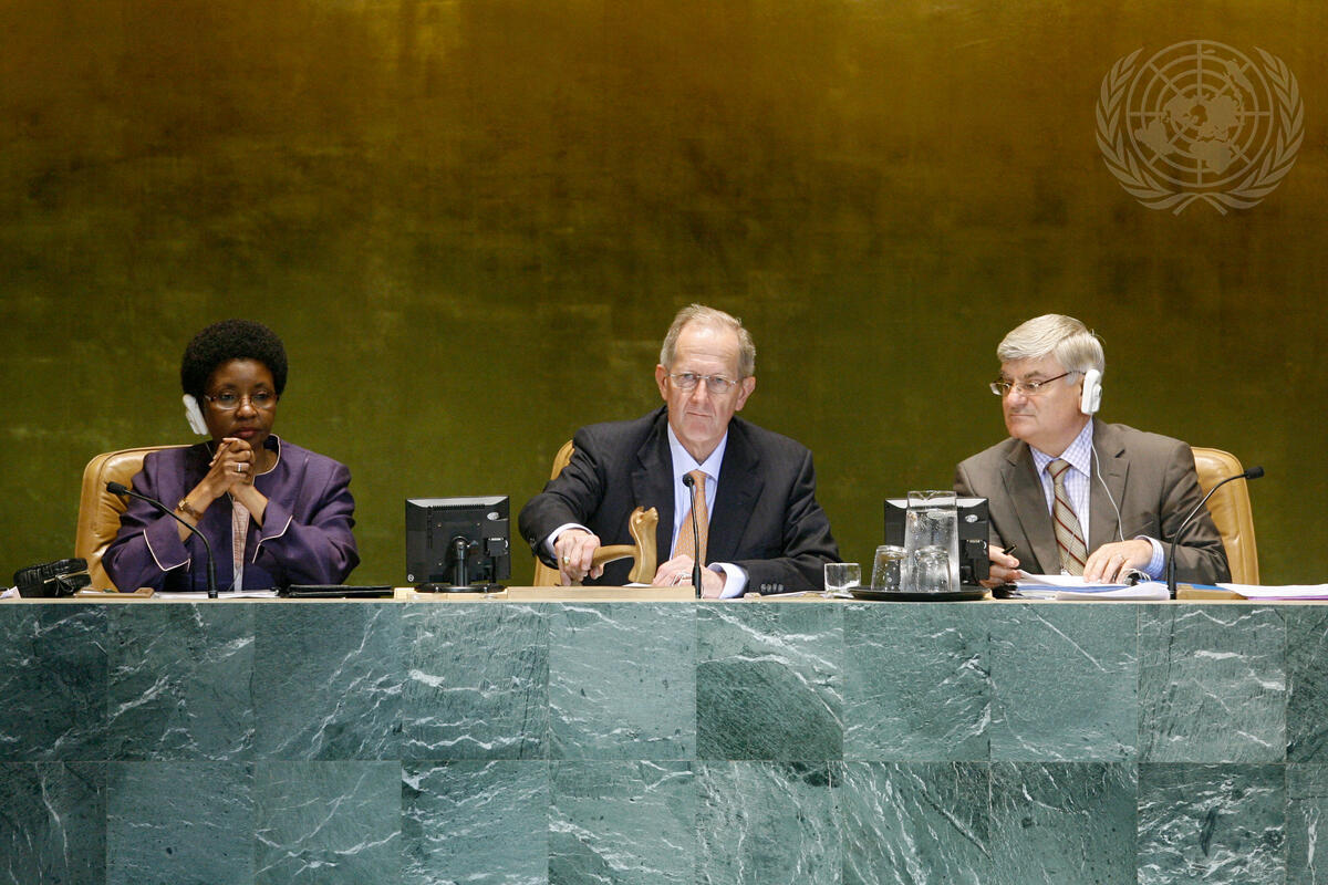 Joseph Deiss (centre), President of the 65th session of the General Assembly, calls to order the resumption the Assembly’s general debate. With him on the podium are Deputy Secretary-General Asha-Rose Migiro (left) and Ion Botnaru, Director of the General Assembly and ECOSOC Affairs Division of the Department for General Assembly and Conference Management.