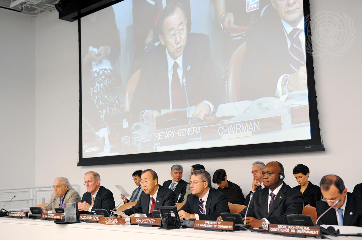 Secretary-General Ban Ki-moon (third from left) convenes a high-level meeting on “Revitalizing the Work of the Conference on Disarmament and Taking Forward Multilateral Disarmament Negotiations”. He is joined by Sergio de Queiroz Duarte (left), High Representative for Disarmament Affairs; Joseph Deiss (second from left), President of the sixty-fifth session of the General Assembly; and Anatole Fabien Marie Nkou (second from right), President of the Conference on Disarmament.