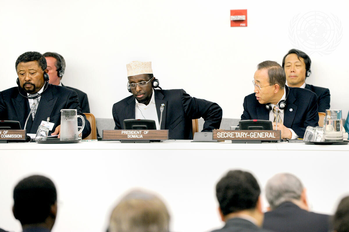 Secretary-General Ban Ki-moon (right) addresses a high-level meeting on the peace process in Somalia. Pictured with him: Sheikh Sharif Sheikh Ahmed (centre), President of the Somali Republic, and Jean Ping, Chairperson of the African Union Commission.