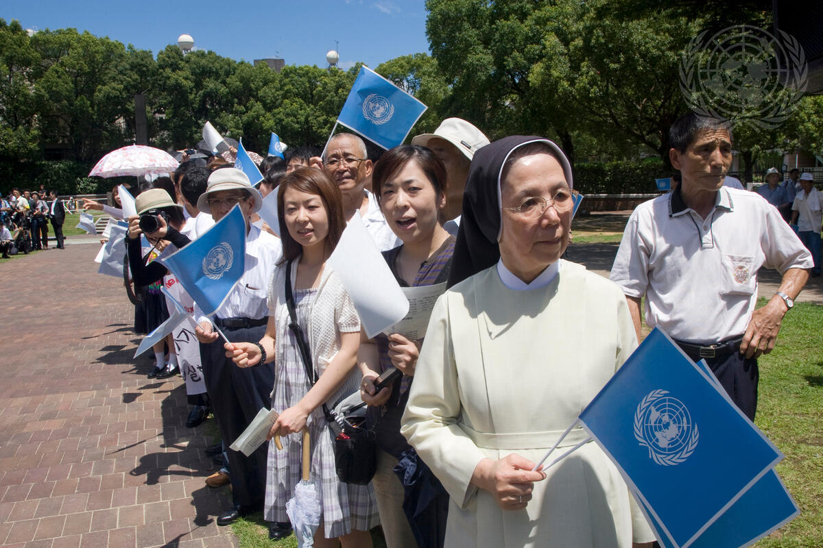 Participants wave UN flags at the memorial tribute by Secretary-General Ban Ki-moon to atomic bomb victims at the Hypocenter Monument located in Nagasaki's Peace Park.