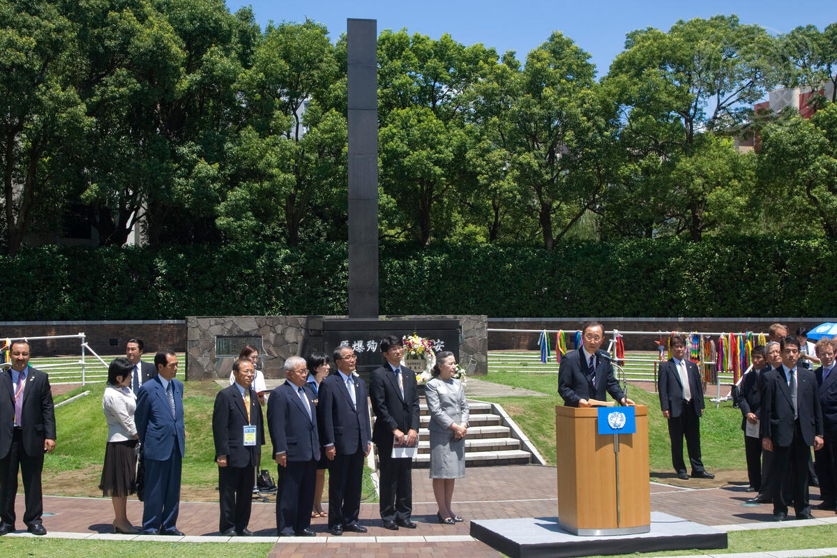 Secretary-General Ban Ki-moon (at podium), accompanied by his wife, Yoo Soon-taek (left of Mr. Ban), delivers a peace message at the Hypocenter Monument at Nagasaki Peace Park, Japan. The monument marks the hypocentre of the 1945 atomic bomb explosion over Nagasaki city.