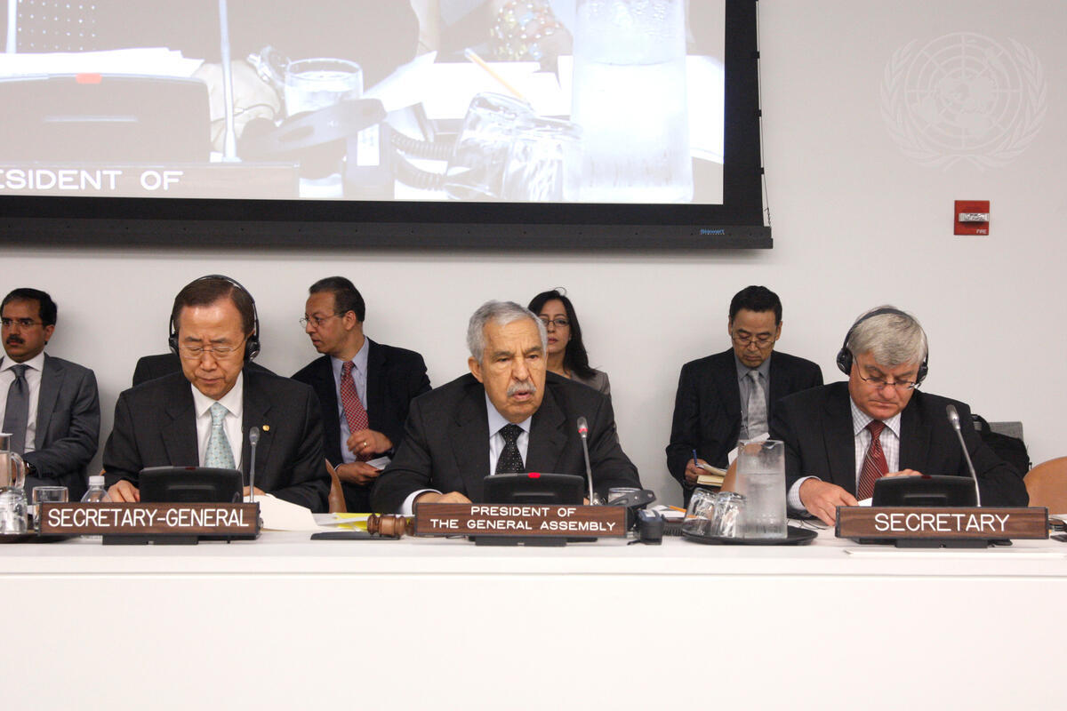 Ali Abdussalam Treki (centre), President of the sixty-fourth session of the General Assembly, chairs the Assembly's thematic debate, ""United Nations Peacekeeping: Looking into the Future"". Mr. Treki is flanked by Secretary-General Ban Ki-moon (left) and Ion Botnaru, Director of the General Assembly and ECOSOC Affairs Division.