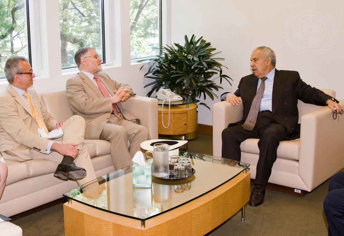 Ali Abdussalam Treki (right), President of the sixty-fourth session of the General Assembly, meets with Juan Antonio Yáñez-Barnuevo (centre), Permanent Representative of Spain to the United Nations, and Pedro Serrano, Acting Head of the European Union Delegation to the United Nations.