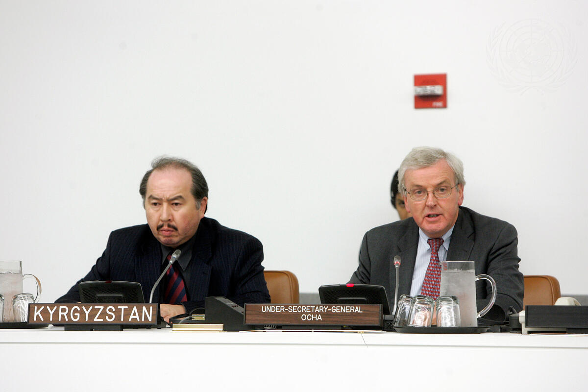 John Holmes (right), Uner-Secretary-General for Humanitarian Affairs and Emergency Relief Coordinator, launches a flash appeal for Kyrgyzstan. The country's deadly clashes between ethnic Uzbeks and Kyrgyz, originating in the town of Osh almost two weeks ago, have resulted in a refugee crisis. Next to Mr. Holmes is Nurbek Jeenbaev, Permanent Representative of the Kyrgyz Republic to the United Nations.