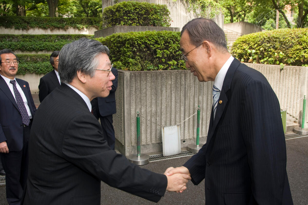 Secretary-General Ban Ki-moon (right) is greeted by Katsuhiko Shirai, President of Tokyo’s Waseda University, as he arrives at the university for a meeting on the UN Academic Impact.