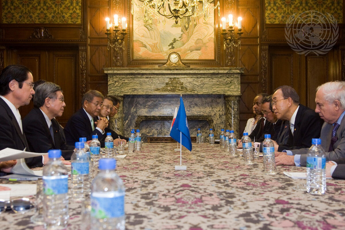 Secretary-General Ban Ki-moon (second from right) meets with Takahiro Yokomichi (across from Mr. Ban), Speaker of the House of Representatives (Lower House) of the Parliament of Japan, in Japanese capital, Tokyo.