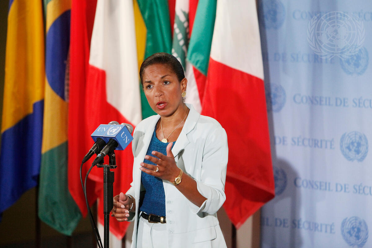 Susan E. Rice, Permanent Representative of the United States of America to the UN, briefs reporters following a Security Council meeting on the situation in Darfur.