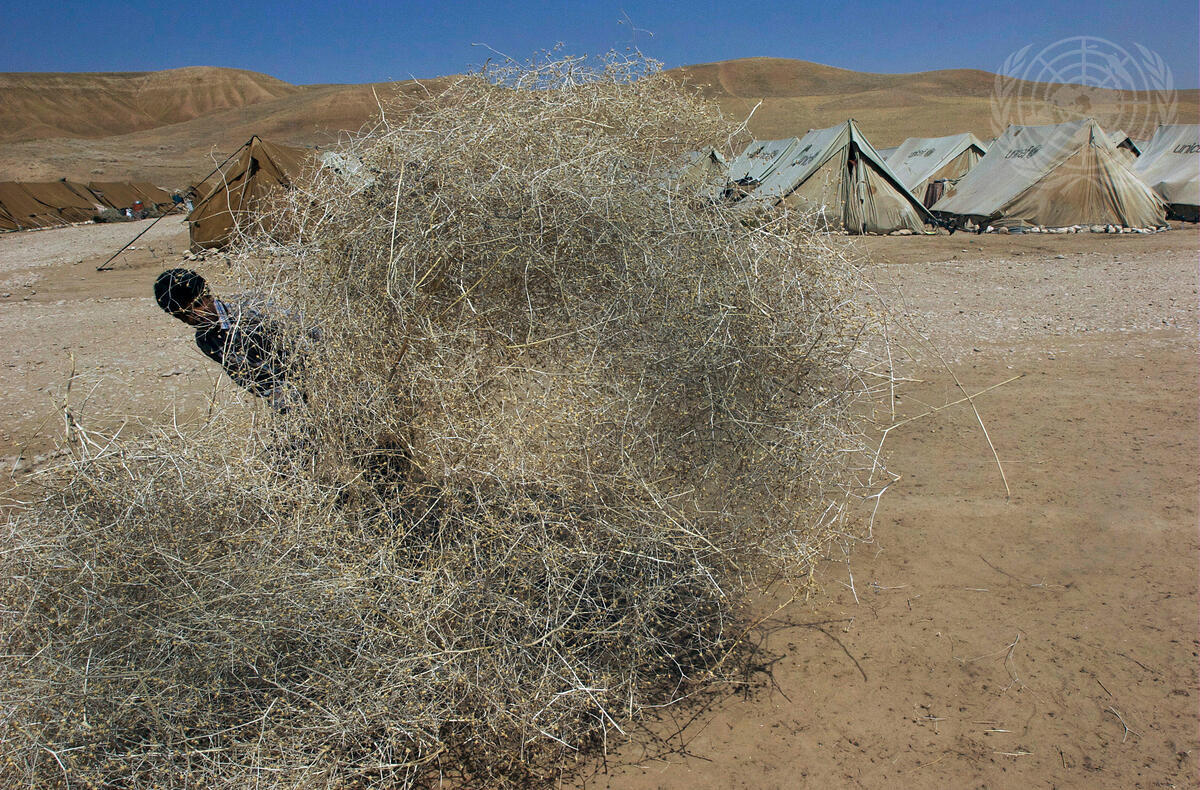 Afghan Boy Gathers Tumbleweeds outside UNHCR Camp
