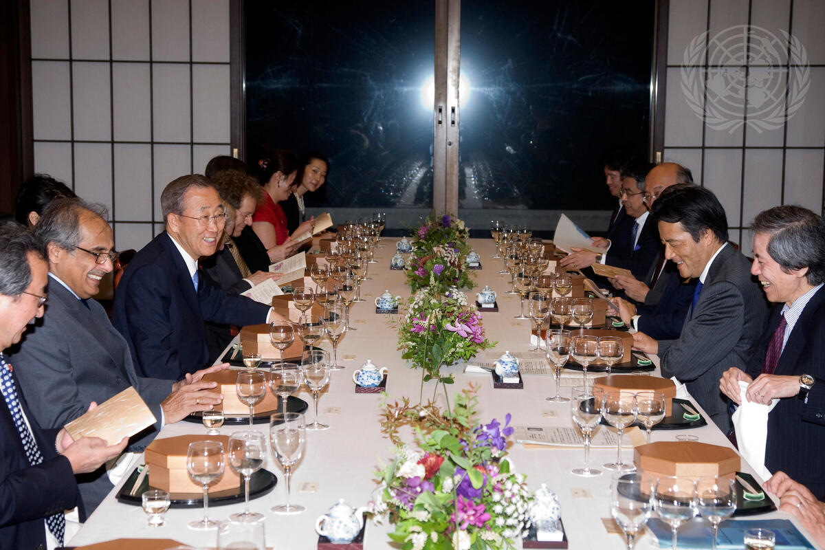 Secretary-General Ban Ki-moon (third from left) attends a working dinner with Japanese Foreign Minister Katsuya Okada (second from right) in Tokyo, Japan. Mr. Ban was accompanied by Kioyataka Akasaka (left), Under-Secretary-General for Communications and Public Information, and Vijay Nambiar (second from left), his Chef de Cabinet