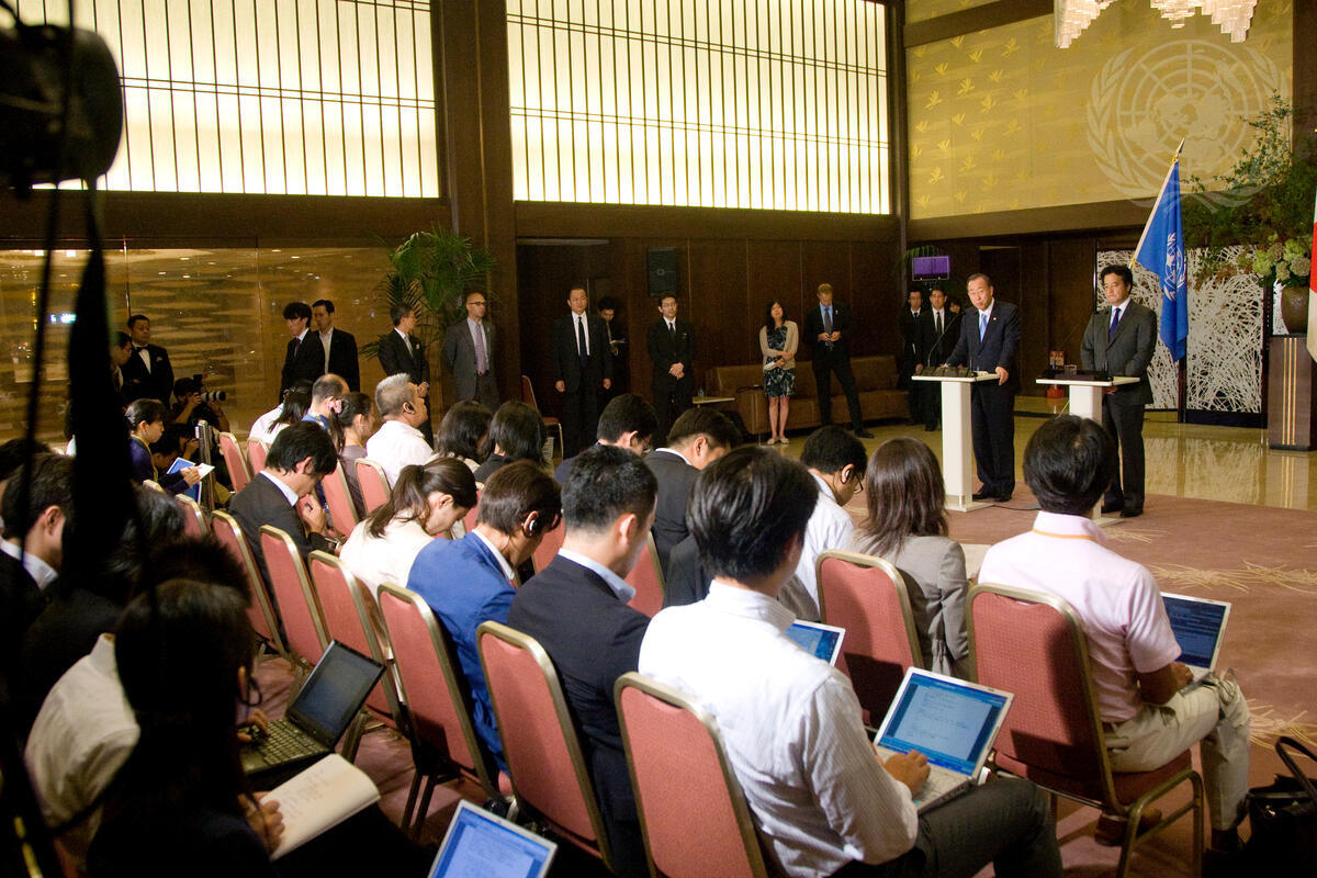 Secretary-General Ban Ki-moon (left) and Katsuya Okada, Minister for Foreign Affairs of Japan, hold a joint press conference following their meeting in Tokyo, Japan.