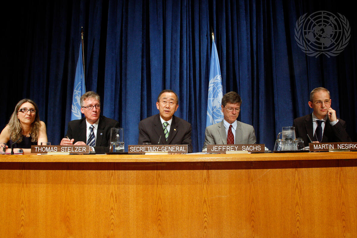 Secretary-General Ban Ki-moon (centre) holds a press conference to brief on his vision for the upcoming G20 Summit (26-27 June) in Toronto, Canada, and launch the Millennium Development Goals (MDGs) Report 2010. With Mr. Ban are (left to right), Francesca Perucci, Chief of Statistical Planning and Development at the Department of Economic and Social Affairs (DESA) and lead author of the Report; Thomas Stelzer (centre), Assistant Secretary-General for Policy Coordination and Inter-Agency Affairs at DESA; Jeffrey D. Sachs, Special Adviser to the Secretary-General on the Millennium Development Goals; and Martin Nesirky, Mr. Ban's Spokesperson.