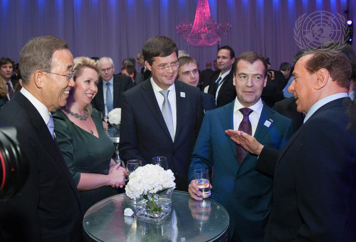 Secretary-General Ban Ki-moon (left) chats with (from right) Italian Prime Minister Silvio Berlusconi; President of Russia Dmitry A. Medvedev; and Jan Peter Balkenende, Prime Minister of the Netherlands; during the opening reception of the Group of 20 (G20) Summit in Toronto, Canada. Following the reception the leaders attended a working dinner inside Toronto's Fairmont Royal York Hotel.