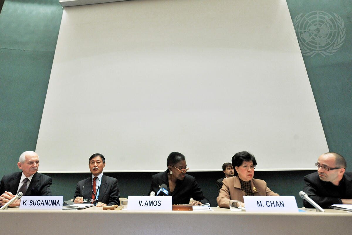 A view of the speakers’ panel at the launch of the UN’s Humanitarian Appeal 2011 at the UN Office at Geneva (UNOG), Switzerland. From left: William Lacy Swing, Director General of the International Organization for Migration (IOM); Kenichi Suganuma, Deputy Permanent Representative of Japan to UNOG; Valerie Amos, Under-Secretary-General for Humanitarian Affairs and Emergency Relief Coordinator; Margaret Chan, Director-General of the UN World Health Organization (WHO); and Pierre Salignon, Director-General of Médecins du Monde.