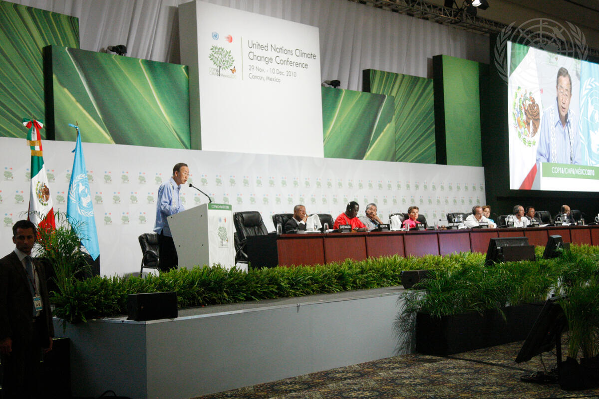 Secretary-General Ban Ki-moon (at podium) addresses the opening high-level segment of the United Nations Climate Change Conference (COP16) in Cancun, Mexico.