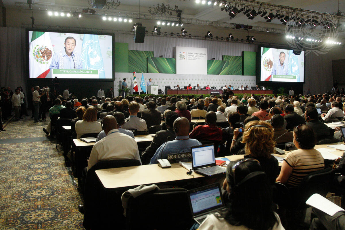 A wide view of the opening high-level segment of the United Nations Climate Change Conference (COP16) at the Moon Palace Hotel in Cancun, Mexico, as Secretary-General Ban Ki-moon (on screens) addresses delegates.