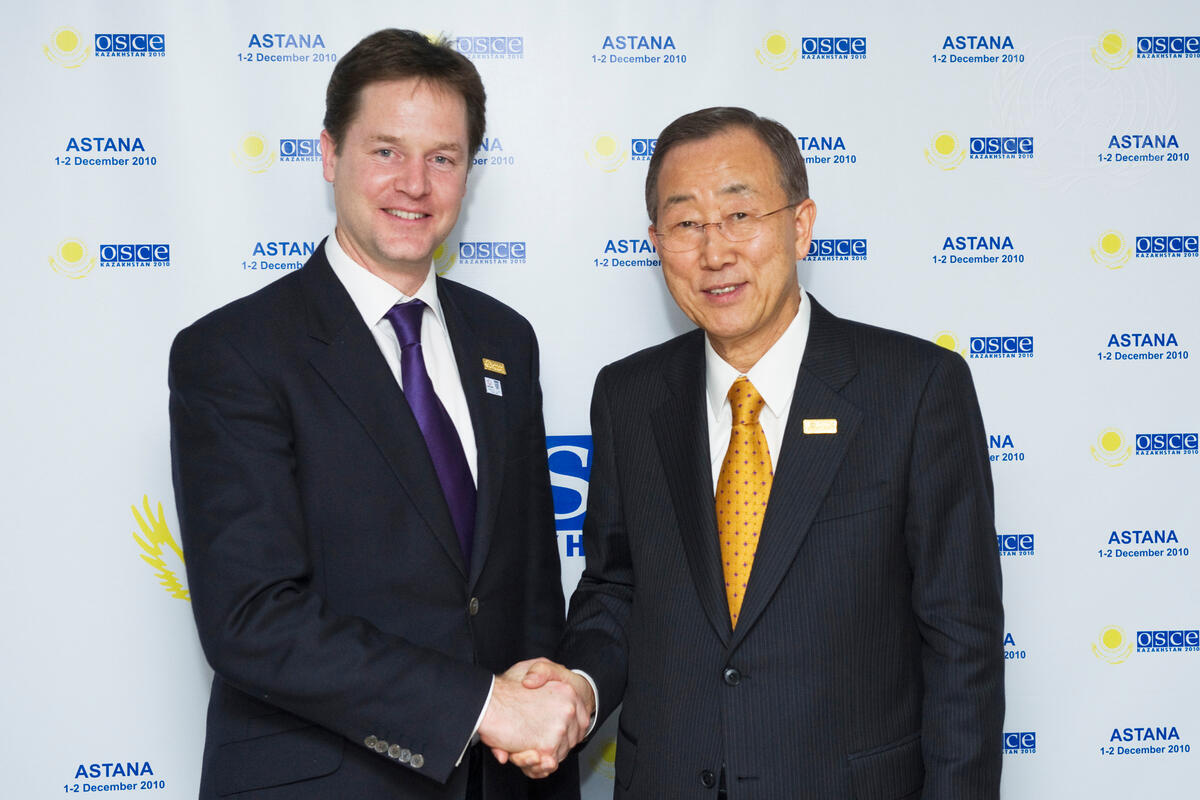 Secretary-General Ban Ki-moon (right) meets with Nick Clegg, Deputy Prime Minister of the United Kingdom, at the Organization for Security and Co-operation in Europe (OSCE)'s summit in Astana, Kazakhstan.