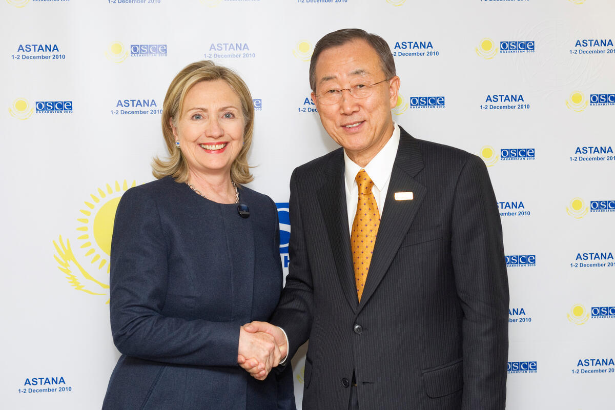 Secretary-General Ban Ki-moon (right) meets with Hillary Rodham Clinton, Secretary of State of the United States of America, at the Organization for Security and Co-operation in Europe (OSCE)'s summit in Astana, Kazakhstan.