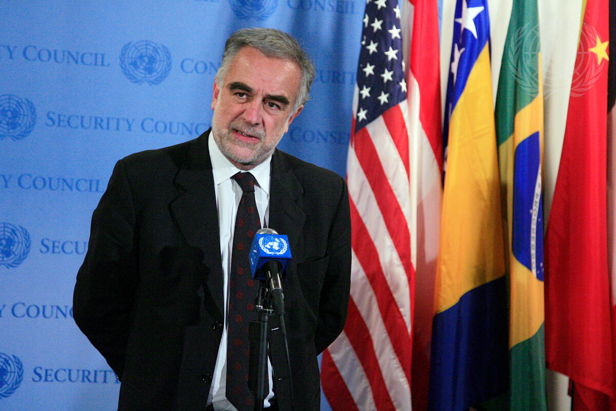 Luis Moreno-Ocampo, Prosecutor of the International Criminal Court (ICC), speaks with reporters following his briefing to the Security Council on the situation in Sudan. In his report to the Council Mr. Moreno-Ocampo highlighted the three charges of genocide levied by the Court against Sudanese President Omar Al-Bashir but added that the Government of Sudan was not cooperating with the Court.