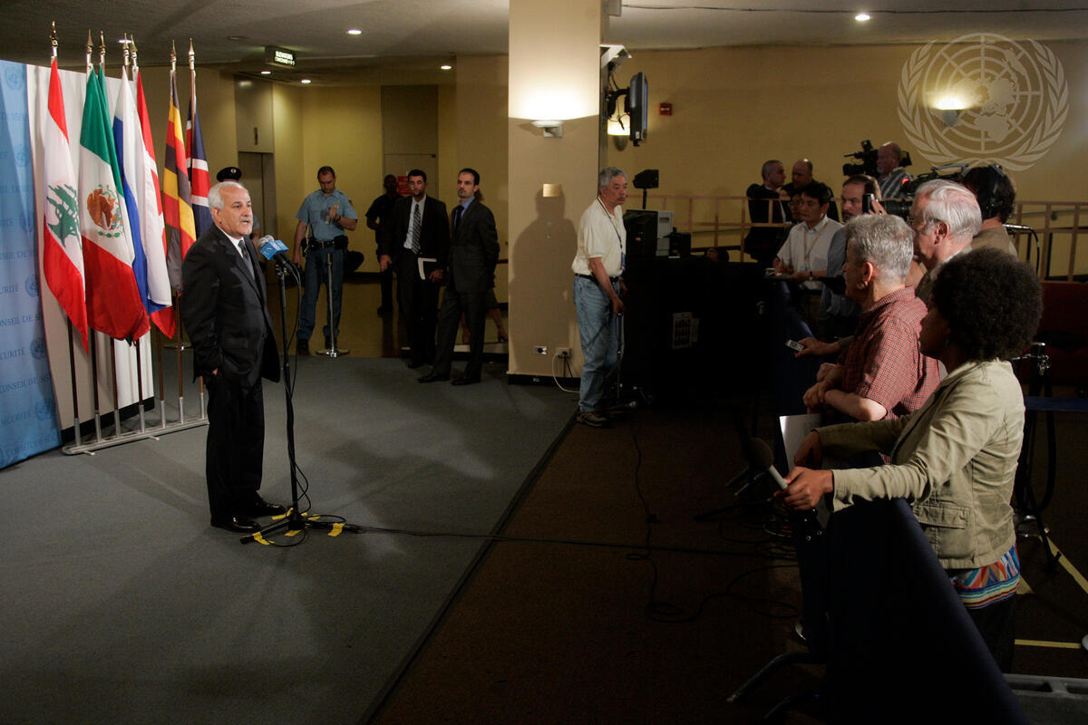 Riyad H. Mansour, Permanent Observer of Palestine to the UN, briefs journalists following a Security Council emergency session on Israel's raid of a Gaza-bound aid flotilla, resulting in the deaths of at least 9 civilians, on 31 May.