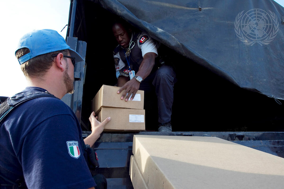A police officer of the United Nations Stabilization Mission in Haiti (MINUSTAH) receives electoral materials destined for camps of displaced Haitians in Port-au-Prince, ahead of the 28 November presidential elections.