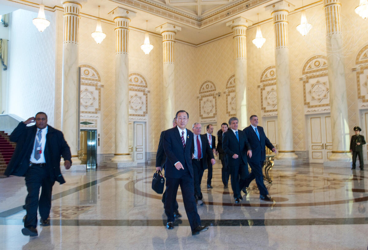Secretary-General Ban Ki-moon (second from left) is shown leaving the office of Nursultan A. Nazarbayev, President of Kazakhstan, following his meeting with Mr. Nazarbayev in Kazakh capital, Astana. Pictured with Mr. Ban are Jan Kubiš, Executive Secretary of the UN Economic Commission for Europe, and B. Lynn Pascoe (third from left), Under-Secretary-General for Political Affairs.