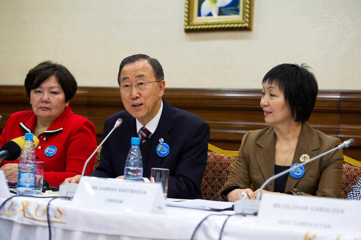 Secretary-General Ban Ki-moon (centre) addresses a special event on Women, Peace and Security organized by the UN Development Fund for Women (UNIFEM) in Central Asia, in Astana, capital of Kazakhstan. Mr. Ban is flanked by Madina Jarbussynova (left), Ambassador-at-Large for Kazakhstan’s Ministry of Foreign Affairs, and Damira Sartbaeva, UNIFEM Regional Programme Director for the Commonwealth of Independent States (CIS).