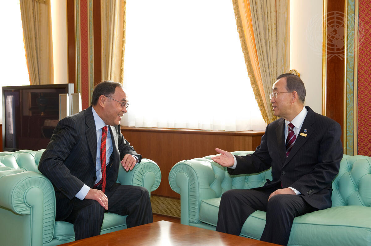 Secretary-General Ban Ki-moon (right) meets with Kanat Saudabayev, Minister for Foreign Affairs of the Republic of Kazakhstan, in Kazakh capital, Astana.
