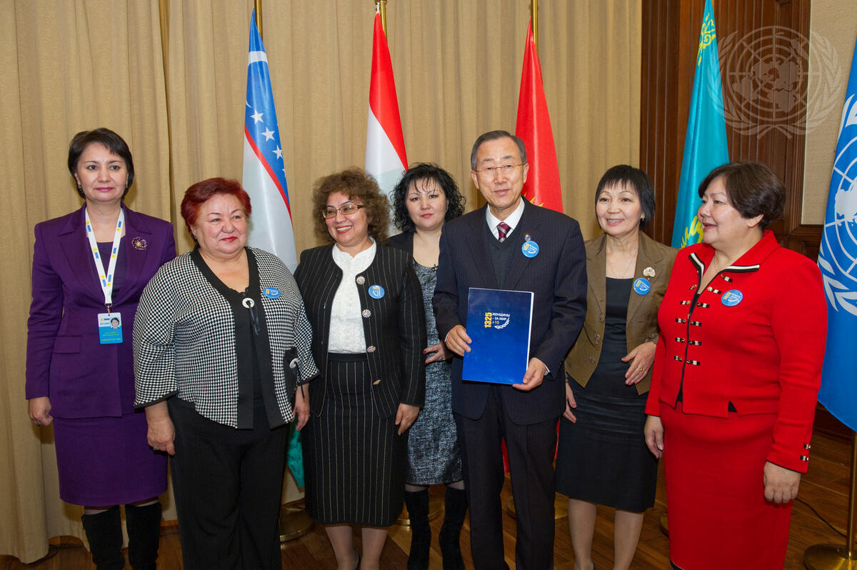 Secretary-General Ban Ki-moon (third from left) poses for a group photo with participants of a special event in Astana, Kazakhstan, organized by the UN Development Fund for Women (UNIFEM) in Central Asia, in collaboration with members of a Central Asia women’s network, on Women, Peace and Security. Mr. Ban holds an appeal delivered to him by the group. Pictured with him (second from left to right): Dilovar Kabulova, Chair of Uzbeskistan’s “Civil Initiative Support Center”; Rafika Musaeva, Member of the Public Council under the President of the Republic of Tajikistan; Zhanna Saralaeva, President of the association “Women Leaders of Jalalabad”; Damira Sartbaeva, UNIFEM Regional Programme Director for the Commonwealth of Independent States (CIS); and Madina Jarbussynova, Ambassador-at-Large for Kazakhstan’s Ministry of Foreign Affairs.